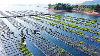 11月14日,在淳安县千岛湖镇坪山生态浮岛上,工作人员正忙着“整地”,换种冬季水上蔬菜,以增强上层水体的净化能力,提升千岛湖水质。 杨波 摄
