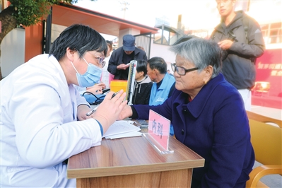 舟山市普陀区展茅街道民生服务综合体里,一名医务人员正在开展义诊。 陈永建 摄