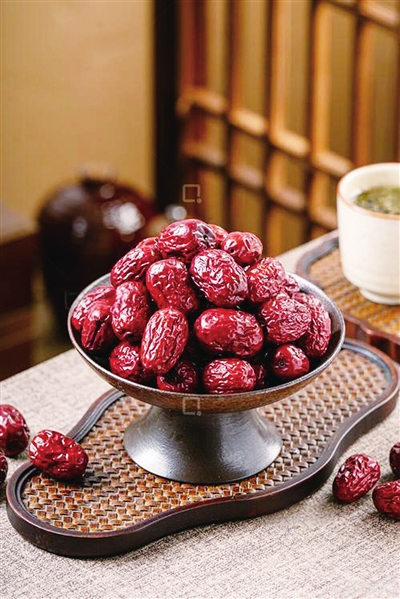 大枣以色红、肉厚、味甘者为佳。气微香,味甜、性温,归脾、胃、心经,可补中益气,养血安神,常用于改善脾虚食少、乏力便溏、妇人脏躁等症状。现代研究发现,大枣富含蛋白质、脂肪、糖类、胡萝卜素、B族维生素、维生素C、维生素P以及磷、钙、铁等元素,其中维生素C的含量在果品中名列前茅,所以有“天然维生素丸”之美称。