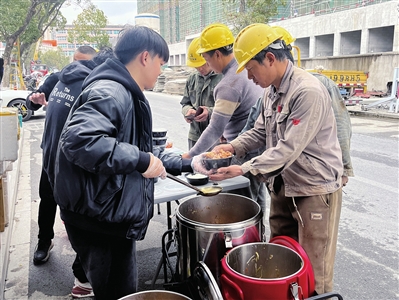 供餐者是26岁的翁斌远,来自乐清,在当地经营一家小饭店。一个月前,他留意到附近工地上工人常为午饭发愁,便萌生制作“专属民工餐”的想法。他精心设计菜单、仔细核算成本,最终将价格定为亲民的10元钱一份,确保有肉有菜、管饱管暖。第一天“试水”,他只准备了50份,没想到刚出摊,两分钟就被“抢”光。此后,他逐渐增加快餐数量。他说:“工人吃得开心,就有意义。我会一直把这份‘民工专属餐’做下去,让更多务工人员能吃上热乎、实惠的饭菜。” 周学军 文/摄