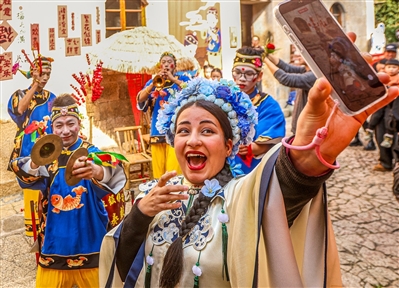 2月5日,温岭市首个簪花主题市集“曙光簪花集”在石塘镇里箬村陈和隆旧宅正式亮相,为期4天的市集活动丰富多彩,除了特色簪花体验,还同步推出非遗民俗展演、“巧手生花”手作互动、新春送福等特色环节,让游客尽享新春佳节的浓厚氛围。图为来自埃及的努兰第一次头戴簪花,体验非遗项目大奏鼓。