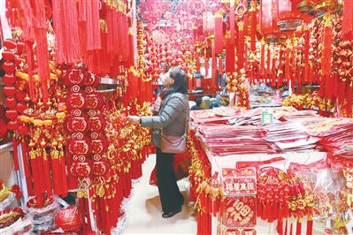 春节临近,在湖州市环城东路小商品市场,各式春联、福字挂饰、红灯笼与中国结开始热卖,浓郁的年味扑面而来。