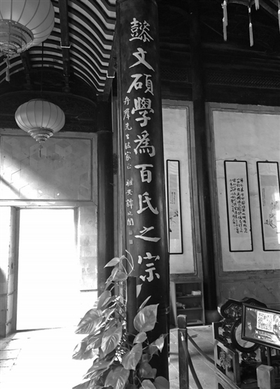位于南浔小莲庄西南侧的刘氏家庙,是南浔“四象”之首刘镛家族祭祖之地。刘氏家庙共三进,依次为门厅、过厅、正厅。门首有两副楹联,第一副是刘家姻亲、世称徐相国的徐郙所书:“于兹冯神福禄来返,以彰懿德诗书是敦。”意思人的荣华富贵都是命运安排,不必刻意去求,坚持“诗书是敦”才是要紧。徐郙出身书香之家,24岁中状元,一品大学士。徐郙擅书画,慈禧常谕徐郙字有福气,晚年御笔作画悉命徐郙题字。他为刘家所题的楹联采用隶书字体,线条流畅,丰厚雍容,富贵大气。刘家跟徐家是姻亲,刘镛的小女儿嫁给徐郙的儿子徐华祥。1894年慈禧六十大寿,特设恩科,刘镛二公子刘锦藻参加会试,徐郙是三位主考官之一。