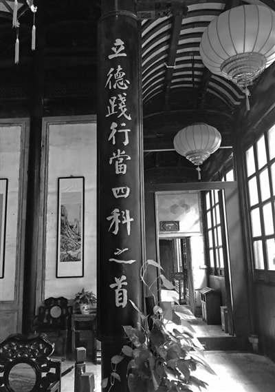 第三进是正厅,正厅又称馨德堂,堂内供奉刘家祖先牌位。正厅门框楹联为南通状元张謇所题: