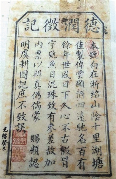 本号向在浙绍山阴十里湖塘佳制,倬云显酒,四远驰名,百有余年,世风日下,又心不古,假冒字号,鱼目混珠,致有参差,故加内票,以辩真伪倘蒙。赐顾认明。虞耕图记,庶不致误。(戳印)