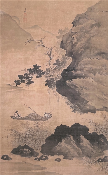 《游船读书图》和《渔舟读书图》,两者均出自浙派画家之手。张路是明代中期浙派名家,其画作承继南宋院体风格,但笔墨却十分奔放。绘《游船读书图》,他用富于动势的创作手法,通过简单的不多的几种物象,刻画出了一位冬日寄情山水,爱梅喜读、嗜书好诗的文士形象。作品主题与古代文人的精神追求息息相关,此作将读书与游船结合,不仅体现了古人沉浸自然的修身养性,也展现了古代文人崇尚读书明志的生活理念。后者《渔舟读书图》之画家蒋嵩,亦是浙派晚期画家代表,该图之创作,采用了深远构图法,取景动静兼得,用笔迅疾,以浓淡墨色渲染明暗,绘图行水上。舟中雅士静坐读书,情境生动,引人入胜。生动描摹了文人寄身山水又神游书卷,于悠悠天地间、烟波浩渺上,自在捧卷而读的惬意时光。