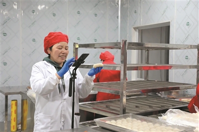 走进共富工坊,生产车间内一派热火朝天的繁忙景象,工人们忙着制作发往全国各地的肉麦饼。