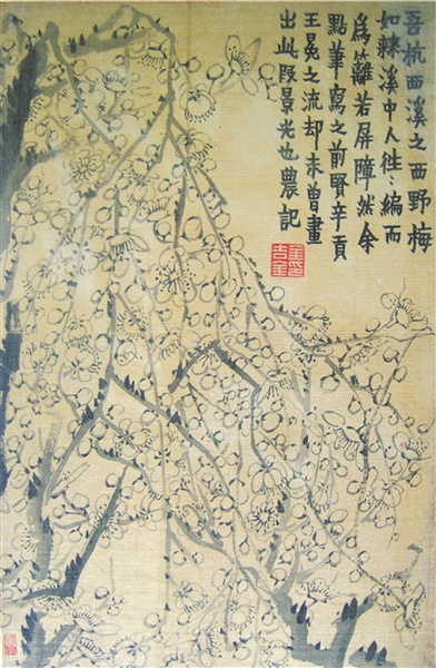 金农笔下的梅花在构图、水墨技法表达主题和提炼形象上都有卓越的成就。由于他高度的表现技巧和深刻的情感产生了非同一般的风格。一次次堆起又一次次散去,一次次疯狂奔向顶峰又一次次重重跌落。好在他找寻到了能抚慰他的“佛”。一枝粗大老梅树的虬枝铁干掠过画面,苍老刚劲的树干,一梅枝盘屈向上,树梢上几朵淡淡的梅花,边款写着大大的七个字“苏伐罗吉苏伐罗”,透出的是生命的顽强。