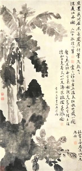 在芭蕉树右侧下方,一块巨石紧紧依偎着芭蕉树干。这块石头形状奇特,轮廓线条简洁流畅,以浓墨渲染而成,显得厚重、沉稳。它的存在,不仅在画面构图上起到了稳定平衡的作用,更象征着一种坚实的力量,与芭蕉的灵动形成鲜明的对比,一动一静,相互映衬,构成了画面独特的节奏与韵律。