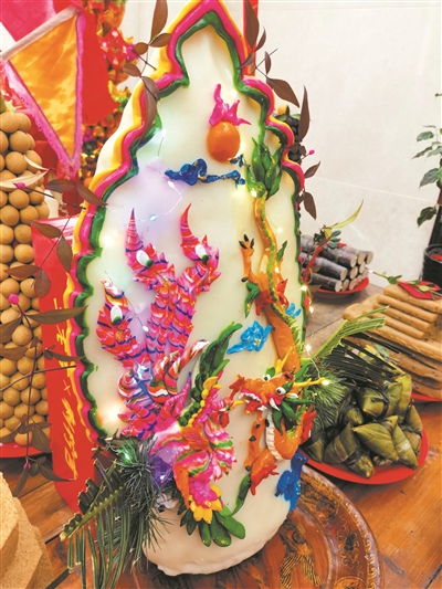 本文所附的温州米塑作品(见图),为民间艺人所作。从此作品来看,一个用米团塑造而成的寿桃,立在八仙桌上,高25厘米,宽15厘米,其上塑着彩色的龙凤米塑图案,呈现了一幅充满生命力和艺术感染力的景象。瞧!龙头威风,龙身矫健,龙爪有力,活灵活现;凤鸟形象优雅,羽毛丰盈,光彩亮丽,形神兼备。在龙凤间有祥云、珠翠加以点缀,增强了艺术效果。值得一提的是,此件米塑作品中的龙凤,不仅仅是图案中的主角,更是吉祥、美好和幸福的化身,“龙凤呈祥”蕴含着深厚的中华传统文化底蕴,值得细细品赏,也契合喜事主题。