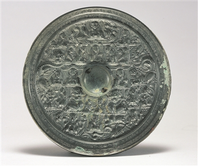 汉代是我国统一多民族封建国家的强盛时期,经济繁荣,金属铸造工艺不断进步,铜镜是汉代铜铸造品中最多的产品。神兽镜是以浮雕手法表现主题纹饰神像、龙虎等题材的镜类,始作于东汉,当时神仙思想达到一个前所未有的高度,对偶像和神人的崇拜已具象化,此镜种在汉末之后依然盛行于魏晋南北朝时期,东汉至三国时期,浙江嘉兴、江苏徐州、湖北鄂州等几个较大的铸镜中心都铸造了大量的神兽镜。神兽镜主要有重列式、环绕式、区段式、对置式等,重列式神兽镜又称阶段式神兽镜,主题纹饰以轴对称的方式由上而下排列,其纹饰题材广泛,涉及神话人物、神兽等多个方面,其基本特点是以神像或佛像与神兽为主要纹饰,衬以装饰花纹和铭文,铜质精良,纹饰精美,而且铭文开始大量出现于镜上,是汉代铸镜工艺最高的镜类之一。