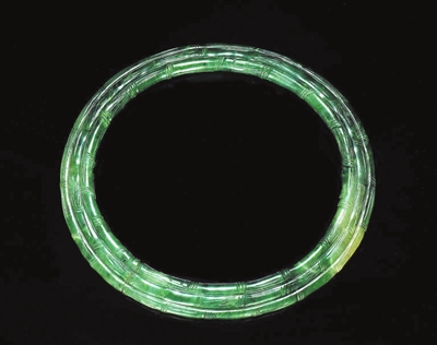 这是一件清代中期碧玉雕竹节仿圈。仿圈,是圈字临帖所用的实用工具。每当临帖时,临帖人先将透光性较好的纸蒙在法帖上,上面再压上仿圈,在仿圈内摹写法帖。通过仿圈可以更好地掌握字体结构,而此时的仿圈也起到了镇纸的作用。这件仿圈以和田碧玉为材,玉质温润,可见黑色斑点散布其中。仿圈作三圈竹枝排列状, 些许嫩叶依势而生,碧玉通透,生机勃勃。整器包浆厚润,刻工精美,纹饰象生,极富皇家御品之雅韵。