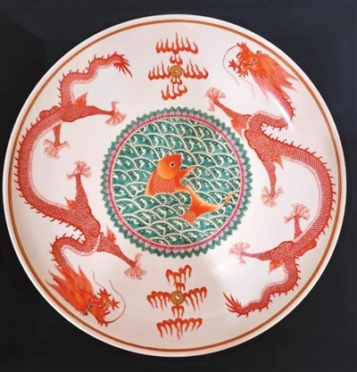 这只红绿彩鱼跃龙门纹盘应当是官窑的产物,圆口、弧壁。盘中央为锦鲤鱼跃,周围有盘龙围绕,色彩鲜艳,线条流畅,给人以古朴典雅之感。这样的图案在那个时代,只有宫廷才可以使用,一般人用了,那就是僭越了。