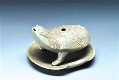 现收藏于慈溪市博物馆的这件越窑青瓷蟾滴,造型可分为上下两部分:上部为水盂,下部是荷叶形托盘。水盂呈立体蟾蜍造型,躯体扁圆,抬头伸颈,口部微张,水可从口中溢出;双目圆瞪,炯炯有神;后背微微隆起,器表布满象征赘疣的灵芝状乳钉装饰,两侧饰以如意形卷云纹;腹腔中空用于盛水,顶部开有注水圆孔;前有稍弯曲蹲伏的双足,趾间有蹼,后端弧收下敛,并有一独足(肢)如尾状支撑。下部托盘大口圆唇,浅腹坦敞,底部为卧足。盘体形似两侧边缘稍内卷的荷叶,内腹壁刻划着纤细清晰的叶脉纹路。