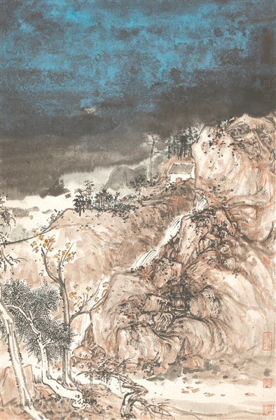 《霞客曾游》采用了前实后虚的构图方式呈现江南山水的常态,同时它又以上重下轻的倒置关系与之对应。它以褐色山体为主体,中间有一瀑布,自右向左斜切画面,在土石草丛间穿过,至底部形成溪流,平缓流出画外。由于处置得体,平和隽永之气扑面而来。作品的左下,画有四树,姿态各异,或耸立、或斜倚,或青葱、或干枯,穿插之势互有呼应。中部树林与房屋隐于山体与白云之间,明明灭灭,氤氲迷蒙,让观者有一种既亲近又有距离感的神秘气息,并起着虚实间的衔接和过渡作用。作者似在不经意间用笔墨很好地表现了人与自然的关系,有举重若轻之感。