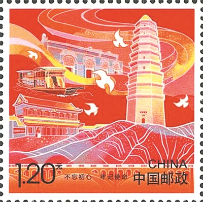 2017年10月18日发行的《中国共产党第十九次全国代表大会》纪念邮票的第1枚“不忘初心”,邮票图案背景为嘉兴南湖红船、新华门和延安宝塔山,代表中国共产党发展历史的不同阶段,并用曲折的暖色带把它们加以贯通,体现了中国共产党从诞生到今天的伟大历程。