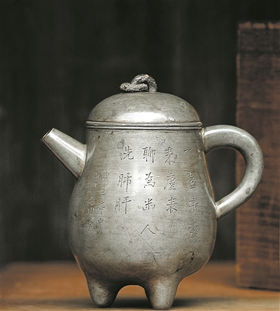 盉为古代酒器,王国维《说盉》:“盉之为用,在受尊中之酒与玄酒而和之,而注之于爵。或以为盉有三足或四足,兼温酒之用。”沈存周制作的这把盉式锡酒壶尺寸为15.8×15厘米,材料为上品锡材,采用熔锡、制模、裁剪等十余道手工工序制作而成,做工极为考究。造型上,圈顶、炮嘴、圆把、三足,线条圆润流畅,敦实厚重,高雅美观。壶身镌有陆游《夜坐独酌》中的诗句“一壶清露来云表,聊为幽人洗肺肝”,并题款“碧玉亭中玩刀,存周”。今年恰逢纪念伟大爱国诗人陆游诞辰900周年,品读壶上诗文,似可异世共饮。