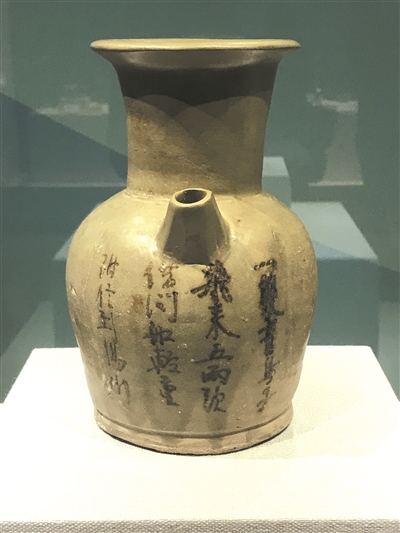 在众多文物中有一件长沙窑是具有代表性的唐代名物,即长沙窑青釉褐彩诗文执壶。壶高18厘米,口径9.1厘米,底径9.6厘米。长沙望城铜官窑窑址出土。由湖南博物院(湖南省文物鉴定中心)收藏,系友情借展,可谓跨越千山万水的文化走亲。