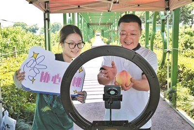 眼下正是嘉兴南湖区凤桥水蜜桃上市季,区政协委员、凤桥镇联丰村党委副书记金云海化身“桃”主播,在桃园里公益直播卖桃,促进农民增收致富。