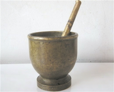 捣药铜盅的形制和配件大同小异,有的药杵是木制镶5厘米长的铜头,有的捣药盅刻有诗文。在古代“药材粉碎机”还未发明的时候,要把药材捣烂成末,就必须先将其放进铜盅里,靠人工用药杵慢慢把药材捣烂成末,然后才能生产膏、丹、丸、散等成药。
