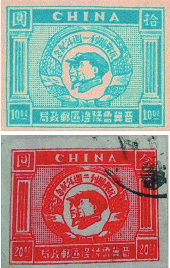 1947年7月7日,原东北解放区邮电管理总局发行“七七抗战十周年纪念”邮票一套4枚。同图异色,邮票画面上战士振臂欢呼,光芒自“7·7”字体内喷薄而出。橄榄枝与钢枪同框,和平与战斗在此握手。同年,晋冀鲁豫边区连发“抗战胜利一周年”和“抗战胜利二周年”纪念邮票各1枚。两套邮票同图异色,邮票画面上毛泽东、朱德的双侧微笑头像被麦穗环抱:麦芒如剑,直指苍穹;石柱如碑,默守忠魂。