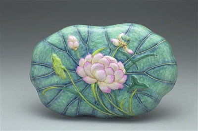“叶上初阳干宿雨,水面清圆,一一风荷举。”烈日炎炎,荷叶轻舞,随风摇曳,似乎在诉说着夏日别样的浪漫与温柔。清乾隆画珐琅荷叶式盒,现藏于台北故宫博物院。此盒为铜胎材质,盒面呈现不规则荷叶造型,盒盖錾刻浅浮雕式一把莲纹饰。粉红娇嫩的荷花与将开未放的花蕾、莲蓬相映成趣,柔顺的莲枝则横依盒身至圈足,再以深绿的线条勾勒叶脉,若隐若现地作为锦地,使嫩红的荷花显得更为淡雅清丽而亮眼。盒内壁涂浅蓝釉,矮圈足饰有装饰图案,底白地中央书红色“乾隆年制”双方框双行楷书款。此盒融合画珐琅与内填珐琅技法,设计雅致,兼具实用与艺术性,是乾隆时期宫廷珐琅工艺中造型独特的典范之作。