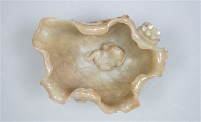明代,玉器制作技艺臻于成熟,文人审美融入其中,赋予玉器文雅之趣。这方青玉浮雕青蛙荷叶洗,以温润青玉为材,质地细腻,色泽柔和,如春日初融的湖水,漾着含蓄的光。工匠以荷叶为形塑造洗身,边缘起伏自然,似微风拂过田田莲叶,泛起灵动涟漪,将荷叶的舒展之态、婀娜之姿,雕琢得栩栩如生。