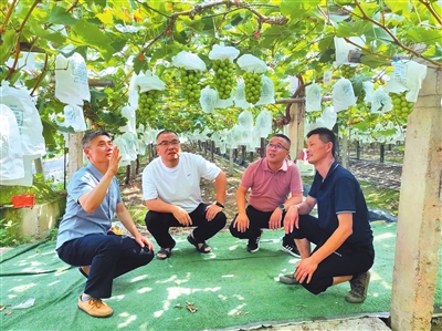 正值葡萄上市季,海盐县政协农业界别组委员深入果园,指导农户开展标准化、智慧化葡萄种植,帮助拓展销路。 通讯员 沈之易 苏晗宁