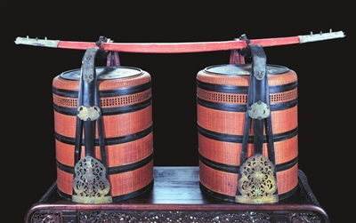 由于套篮体型较大,往往两只成双,因此不能手提,需要肩挑。套篮两只合为一副,篮柄中间内凹处的上端镶有铜制的吊环,用于肩挑时的依托。吊环的制作颇具工艺性,在实用的基础上,给人以装饰的美感。每只套篮的黑漆盖面上用泥金写着祠堂或主人的姓名,书法亦甚讲究。