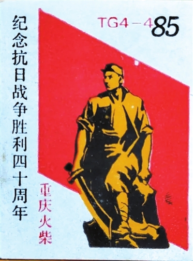 抗战胜利后,不少火柴厂推出以抗战胜利为题材的火花,将抗战胜利全民欢欣的喜悦凝于方寸画面。如上世纪四五十年代,广东花地大益火柴厂“胜利”火花,以醒目的“胜利(VICTORY)”的首字母构型,红色底色烘托出热烈庄重的氛围;胜利火柴厂的“胜利”火花,以灯笼为画面,中央“胜利”二字以雄浑笔触挥就,辉映着从烽火走向黎明的壮阔历程;什邡火柴厂上世纪60年代的“胜利”火花,背景中天安门城楼与人民英雄纪念碑交相辉映;1985年重庆火柴厂出品的“纪念抗日战争胜利四十周年”火花一套4枚,画面中,战士身着军装,握持简陋却锋利的武器,姿态坚定如山。第4枚火花,持刀战士的剪影?如青铜雕塑般凝固战火瞬间,?刀刃凛冽的锋芒?直指侵略者,?足部蹬地?的姿态积蓄着爆发力,尽显《大刀进行曲》的杀伐之气。