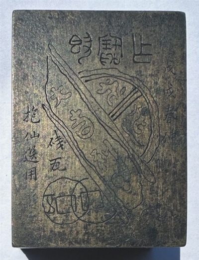 沈抱仙于光绪十一年(1885)乙酉科浙江乡试中式第36名举人,年仅26岁,按当时中举年龄大多在30多岁,可谓少年得志。又在13年后的光绪二十四年(1898)戊戌科考中进士,三甲39名,授刑部主事。墨盒年款戊戌春仲,也正是沈抱仙赴京参加三月初九礼部会试之前。可以想见,当年沈抱仙等一众萧山举人,风尘仆仆赶赴京城,在北京西河沿萧山会馆住下之后,自当先去琉璃厂置办考试文具,都讲究用李玉田制的毛笔、陈寅生的刻铜墨盒、周金盛制作的折扇。陈寅生是秀才出身,光绪初年在琉璃厂开设万丰号刻铜铺。沈抱仙或许就是在万丰号选中了这方砖瓦纹铜墨盒,留下“戊戌春仲、抱仙选用”墨迹,请陈寅生把字迹刻上墨盒,留作纪念。