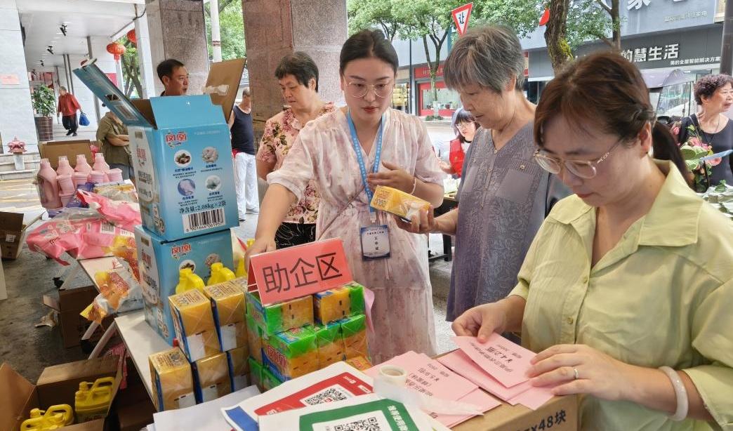 在社区党群服务中心的另一侧,来自本地乡镇(街道)的特色农产品与小微企业匠心产品、“兰溪优品”琳琅满目。青年党员志愿者化身热情的“推销员”,向居民介绍着每一份产品背后的乡土故事与创业艰辛。新鲜采摘的瓜果蔬菜、手工制作的特色小吃、精巧实用的文创产品……居民既以实惠价格购得心仪好物,为乡村振兴和小微企业发展注入了一份支持力量。一位售卖土特产的农户脸上洋溢着感激:“社区搭台,党员助力,让我们的好产品直接对接邻里需求,这份‘家门口’的支持太珍贵了!”