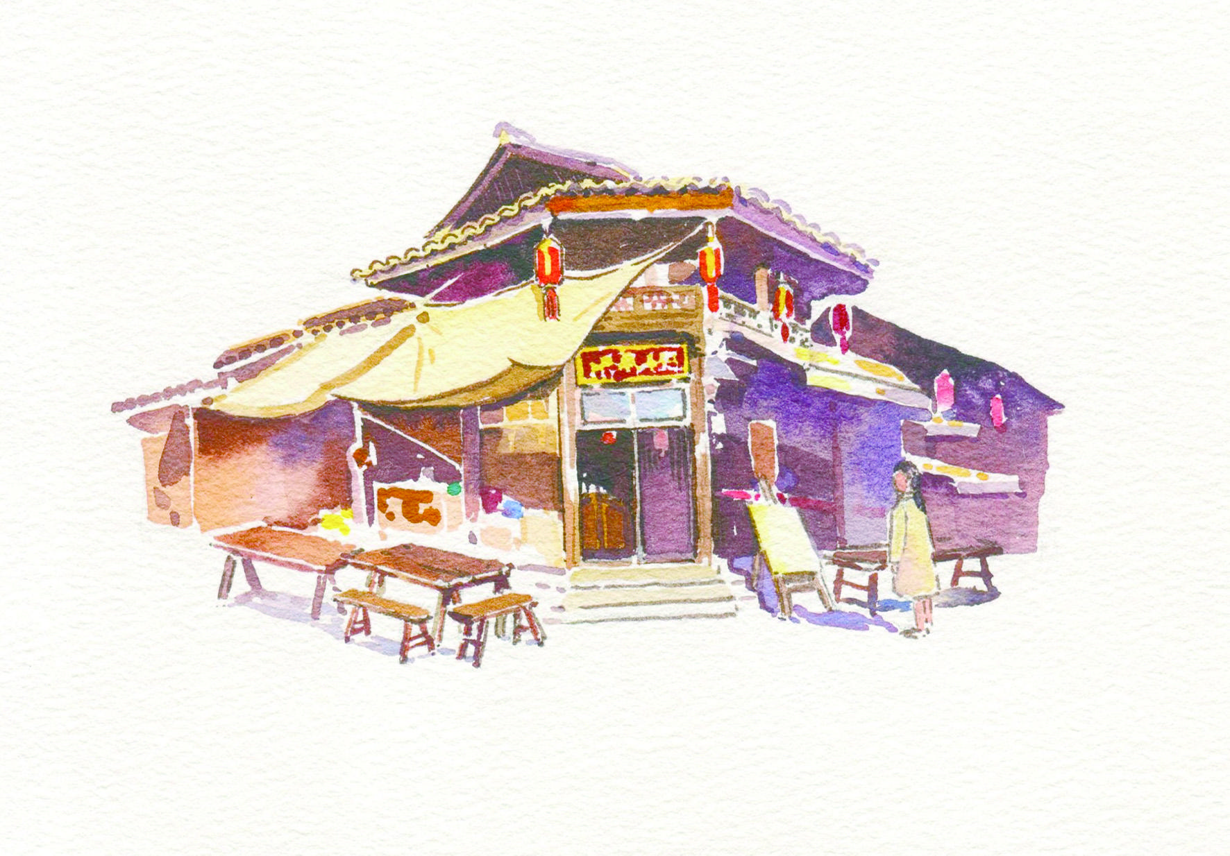 去年4月,圈圈去游埠古镇采风,拍下了100多张老街巷的照片。“一直想画一画这个被历史留下来的古镇,里面的建筑、古街、手艺人都很吸引我。像老百货大楼,第一眼看到这个房子时,我就很喜欢它的结构,有一种被时光冲刷后的年代感,淡淡的蓝色木质外墙非常特别,让我很有想画的冲动。”圈圈说,这些画,大概画了一个月。她还记得当时画起来很有激情,每天上完课,一有时间就见缝插针地画,白天没空就利用睡前画一幅。