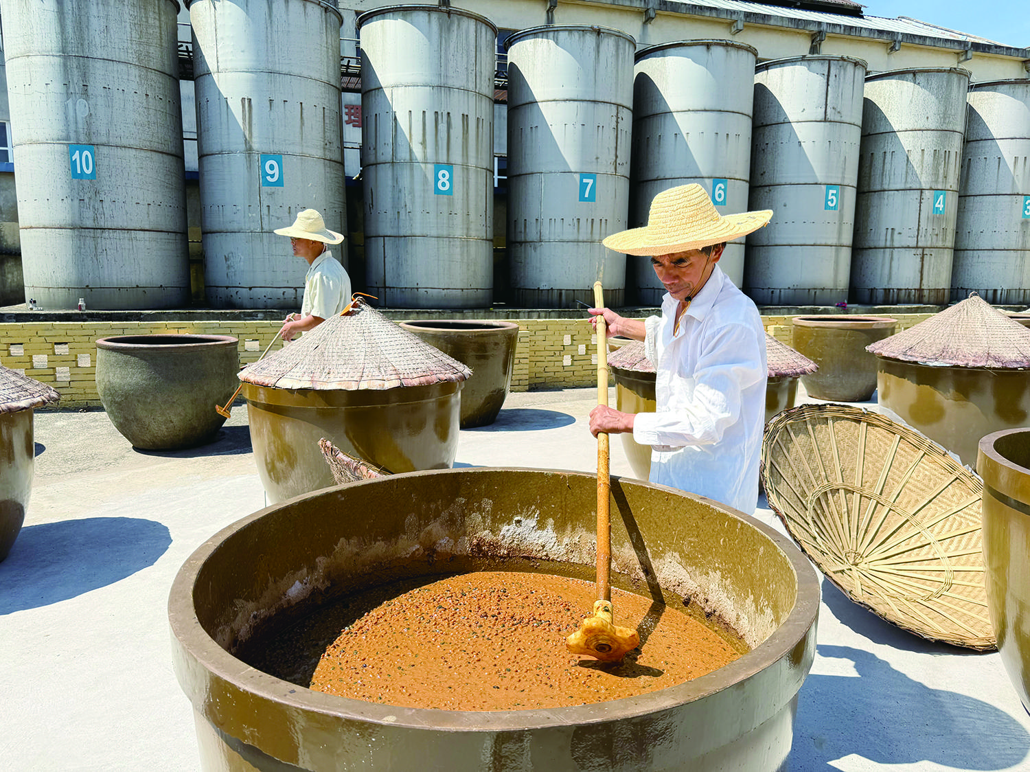 导报讯 “豆子入缸发酵的头个月最是关键,每日晨昏需翻动两次透气,眼下正是最忙的时候。”8月18日,记者在浙江依诺生物科技有限公司看见,三四十只陶缸与20只不锈钢桶在烈日下整齐排列,工作人员手持木耙穿梭其间,翻动缸中发酵的豆粒,豆香混着热浪扑面而来,该公司负责人赵庆君望着满园酱缸笑道:“别看这活儿土,我们一年能酿出1000吨酱油, 全靠这‘慢工出细活’的功夫。”