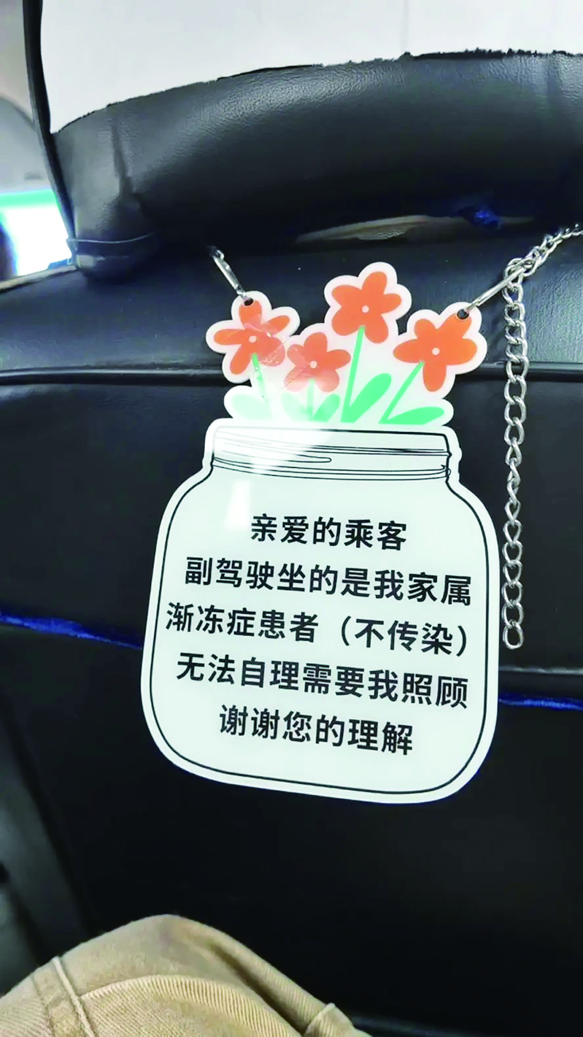 早上6时,和三个孩子打过招呼,王杰准备开车上路。丈夫崔文军安静地坐在副驾驶座位上,他的座椅背后挂着一块有花朵装饰的提示牌,上面写着:“副驾驶坐的是我家属,渐冻症患者(不传染),无法自理需要我照顾,谢谢您的理解。”
