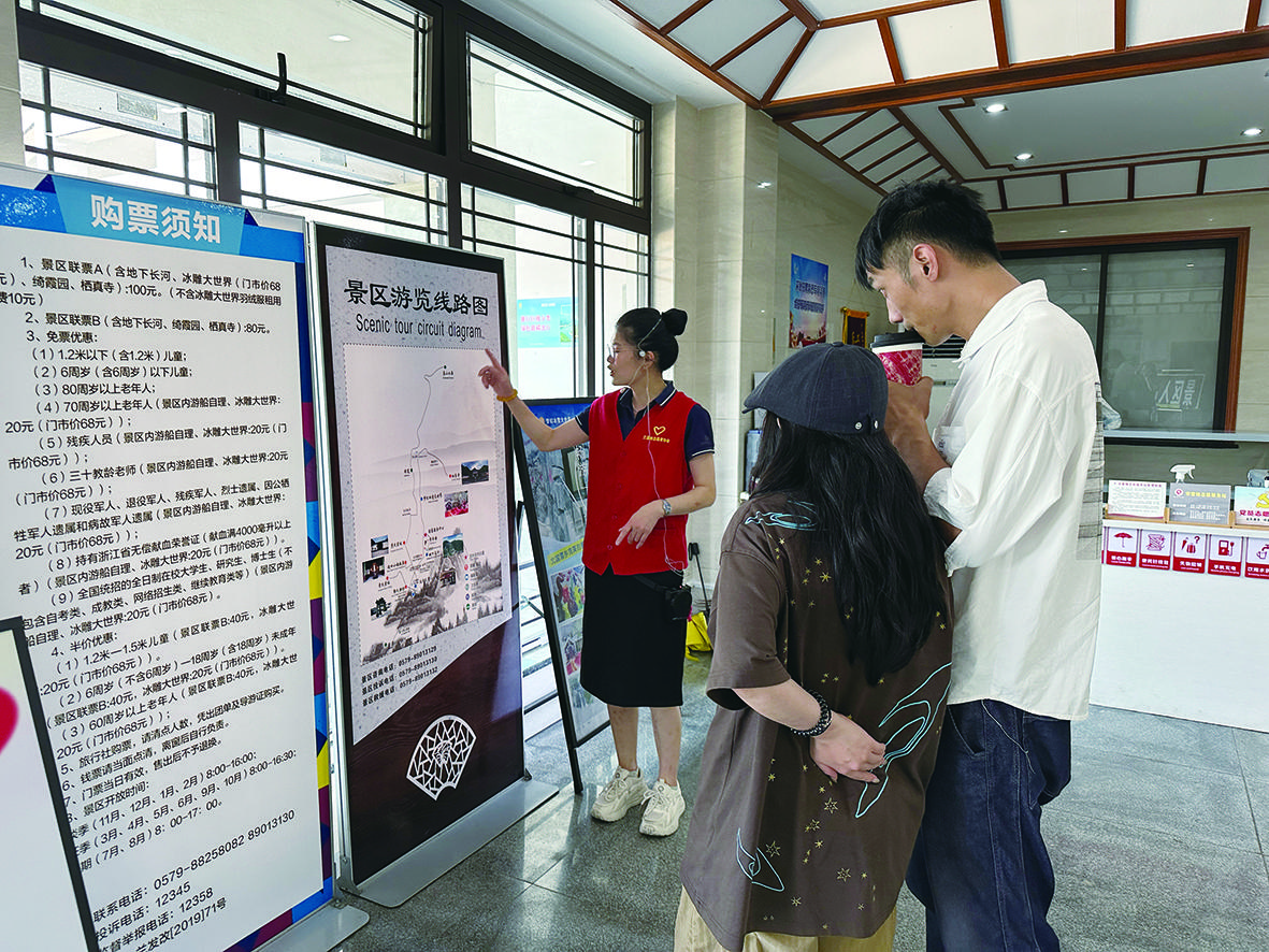 正值暑期,兰溪各大景区迎来了一波旅游高峰。昨天,在六洞山景区,多名志愿者在向游客讲解旅游内容,劝导大家遵守景区秩序、文明旅游。