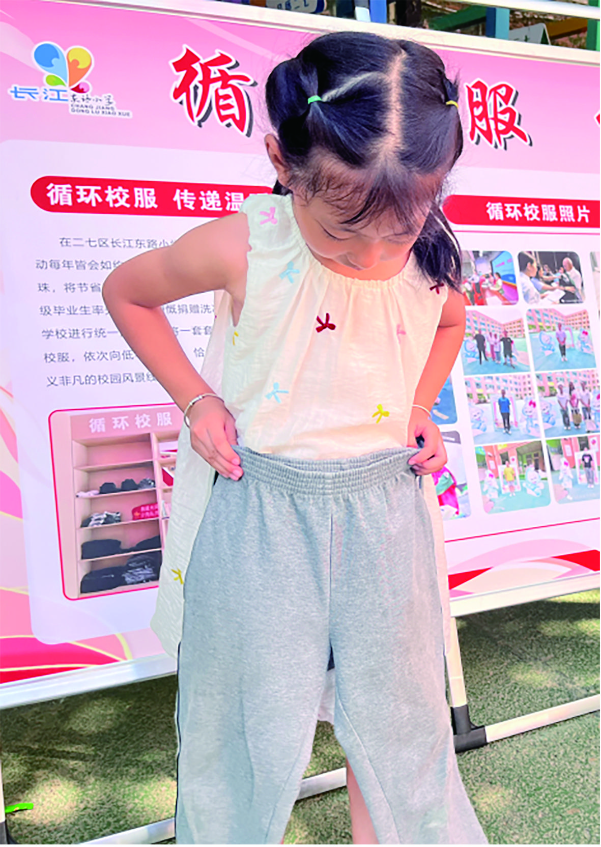 即将升入四年级的赵梓桐已经第二次参与校服“循环”,今年暑假他将入学时领取的130码校服洗净后交还给学校,又免费领取了一套150码的校服。