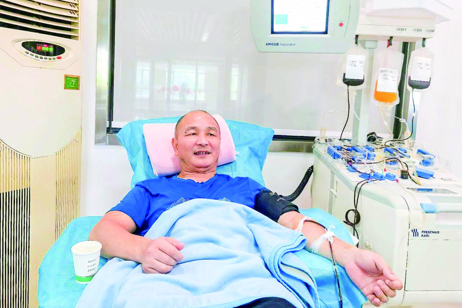 填表、体检、检验……身体检查合格后,鲍伟明走进献血室,躺在床上熟练地拿着采血球一握一松,看着身体里的殷红热血分离出淡黄色的血小板。当天,他献出了双份血小板,也就是400毫升,可以用在两位病人身上。