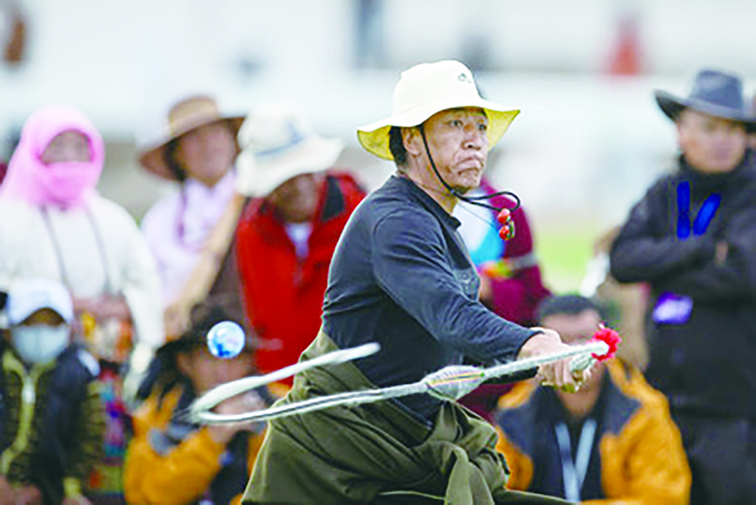 图为9月6日,在那曲市恰青赛马节现场,一名选手参加乌尔朵比赛。