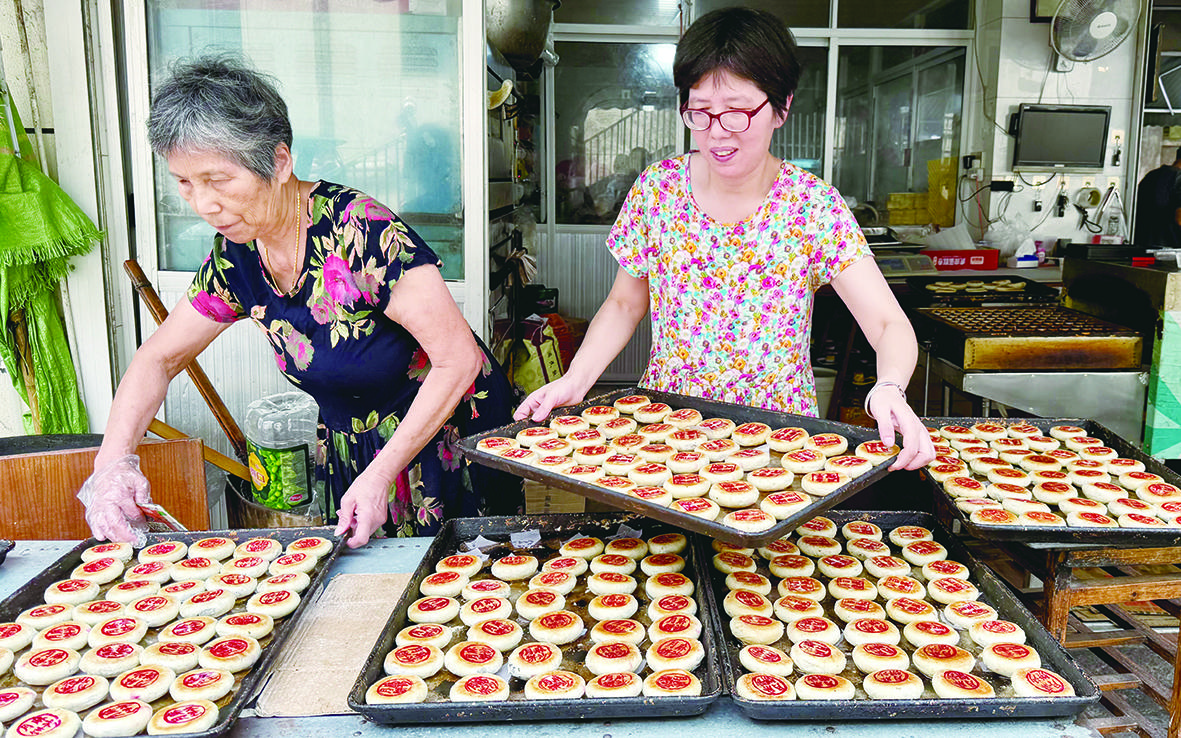 昨天,在兰溪溪西农贸市场附近的一家糕饼店里,几名员工正忙着制作不同口味的苏式月饼。