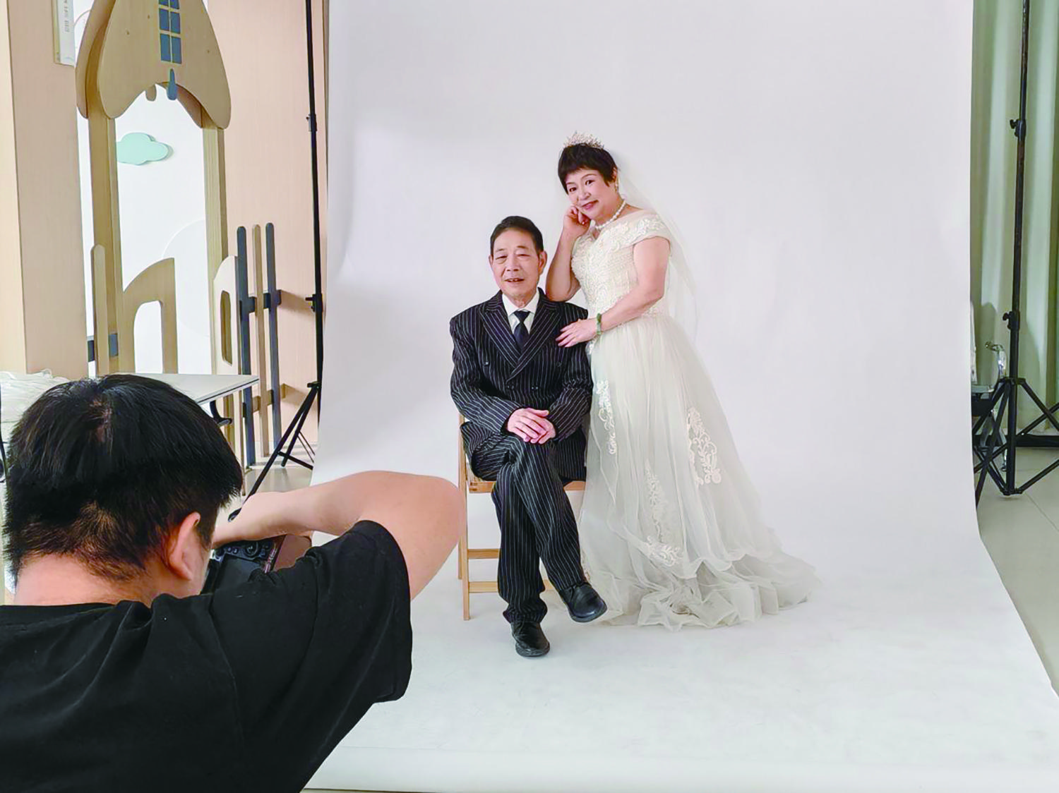 活动现场,80岁的叶大伯和71岁的朱阿姨第一次穿上了笔挺的西装与雪白的婚纱,在镜头前紧紧相握的双手微微颤抖。两人坦言,因经济条件有限,结婚时仅有一张黑白登记照。如今,两人相濡以沫携手相伴了五十年,今年刚好迎来了金婚。“现在条件好了,我们也体验体验年轻人说的‘仪式感’。”叶大伯说,化妆师特意为朱阿姨设计了时髦卷发。“叔叔,再靠近阿姨一点,对,笑一笑!”随着快门声响起,摄影师用镜头为两位老人定格下跨越半个世纪的爱情印记。