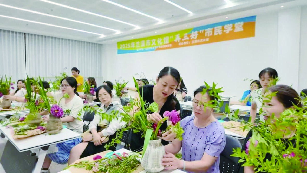 近日,在兰溪“再三好”市民学堂的花艺设计课上,老师在认真教学员插花。