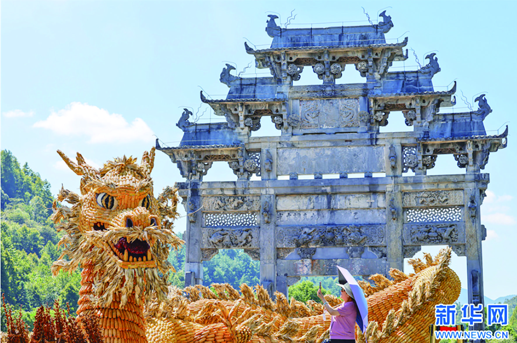近日,安徽省黄山市黟县的西递古村落迎来晒秋盛景,一条由玉米堆砌而成的50米长“巨龙”蜿蜒于西递牌楼旁,五彩的晒秋景观与鳞次栉比的徽派建筑相互映衬,吸引众多游客前来欣赏游玩。
