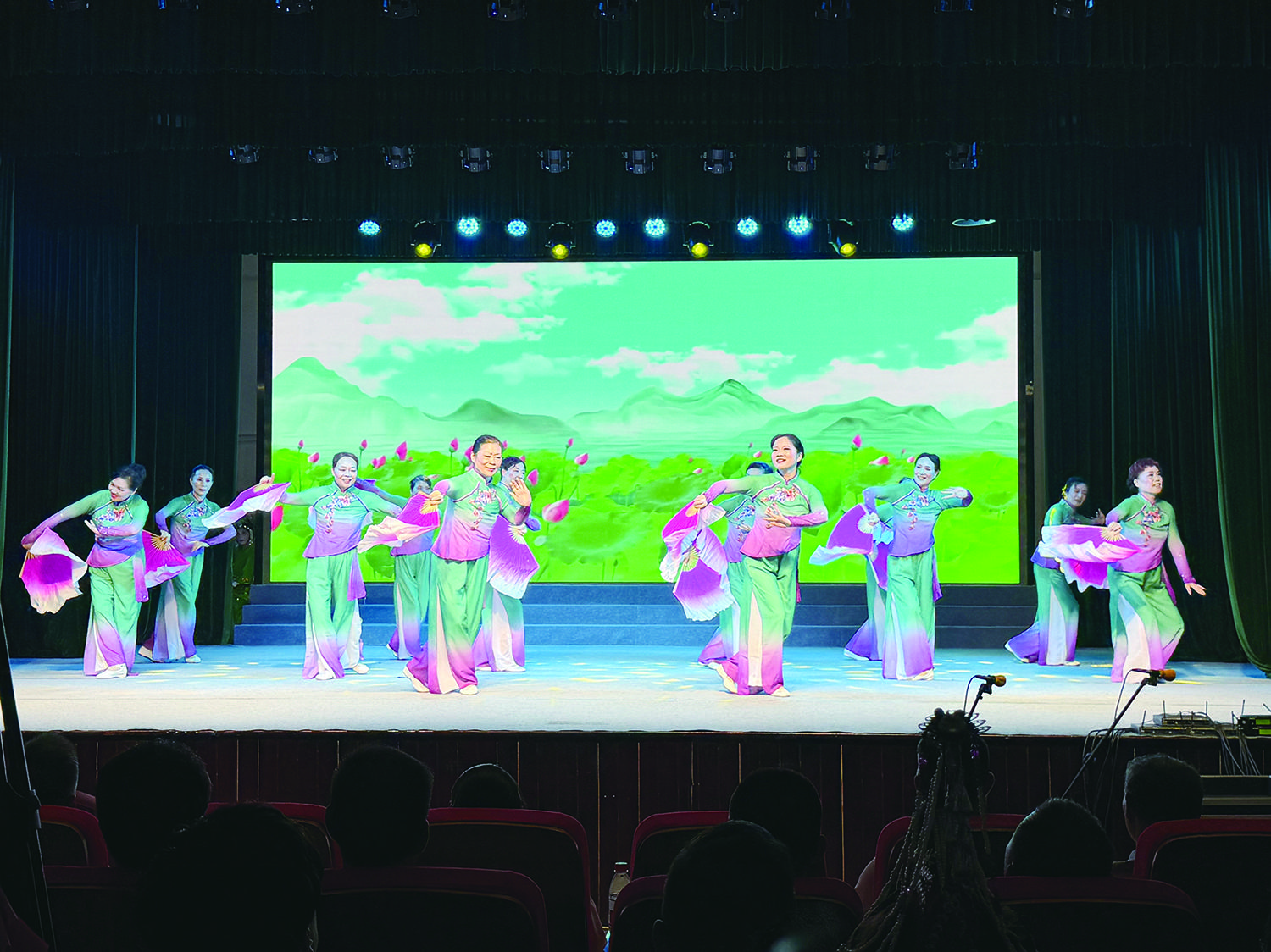 晚会现场,热闹非凡,营造了浓浓的节日氛围。首先登台的是由市老体协体育舞蹈专委会带来的秧歌《欢天喜地》。舞者们身穿统一的绿色衣裳,手执粉色花边扇,好像夏日的荷塘景色,朝气勃勃。她们展示的轻盈舞姿、带来的欢快节奏,瞬间点燃了现场观众的热情。随后,管乐演奏《中国人民解放军进行曲》《当那一天来临》、婺剧《打金枝·闯宫》等节目轮番上演,引发阵阵掌声。