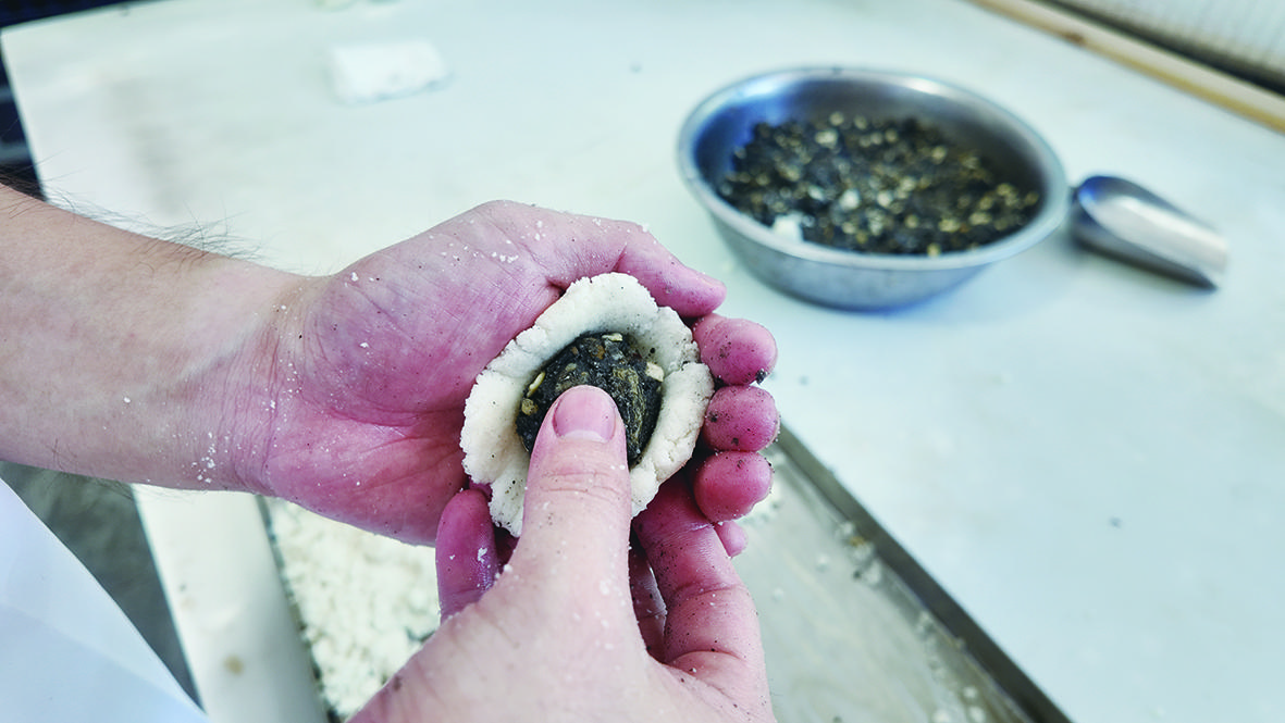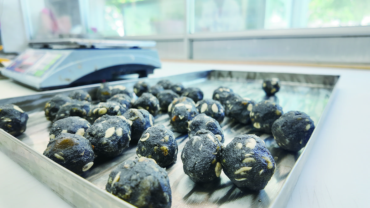 炒熟的米粉加糖粉和油按比例配好,馅料用的是芝麻百果。“每年中秋节前一个半月就要开始配料了,生芝麻买来炒熟,磨成芝麻粉。”章程说,百果馅是兰溪最传统的口味,可以算作兰溪的“伍仁”,比广式月饼多几分江南的纤细。减糖的配方让芝麻香愈发清透,像极了江南人含蓄的甜。