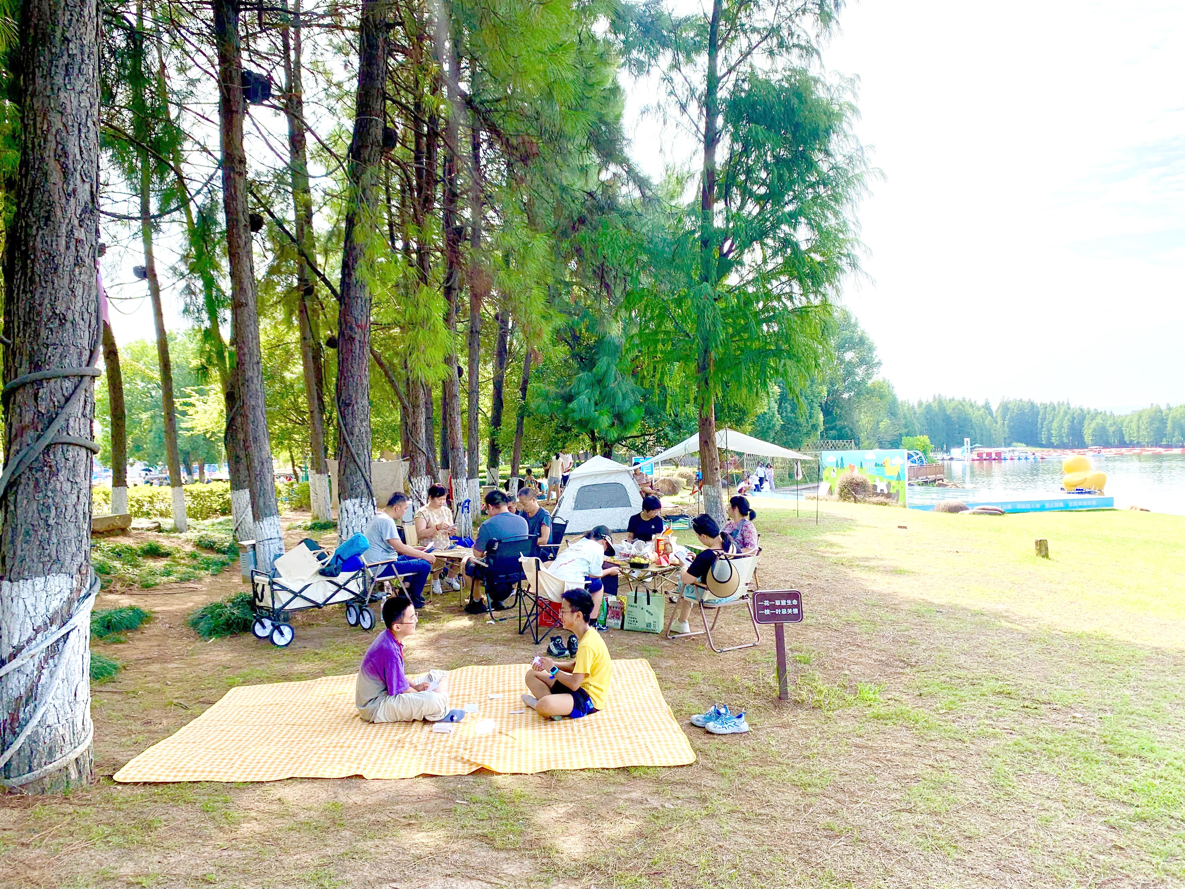 与音乐会的热闹相映成趣的是露营区的悠闲景象。来自湖州的朱翕涵一家正在树荫下布置野餐,彩色的帐篷在草坪上格外醒目。“兰湖不仅风景好,生态环境也很棒。”朱翕涵一边摆放水果一边说,“趁着假期和家人过来玩,等野餐完就去坐小火车,听说能穿过树林,还能欣赏到湿地风光。”