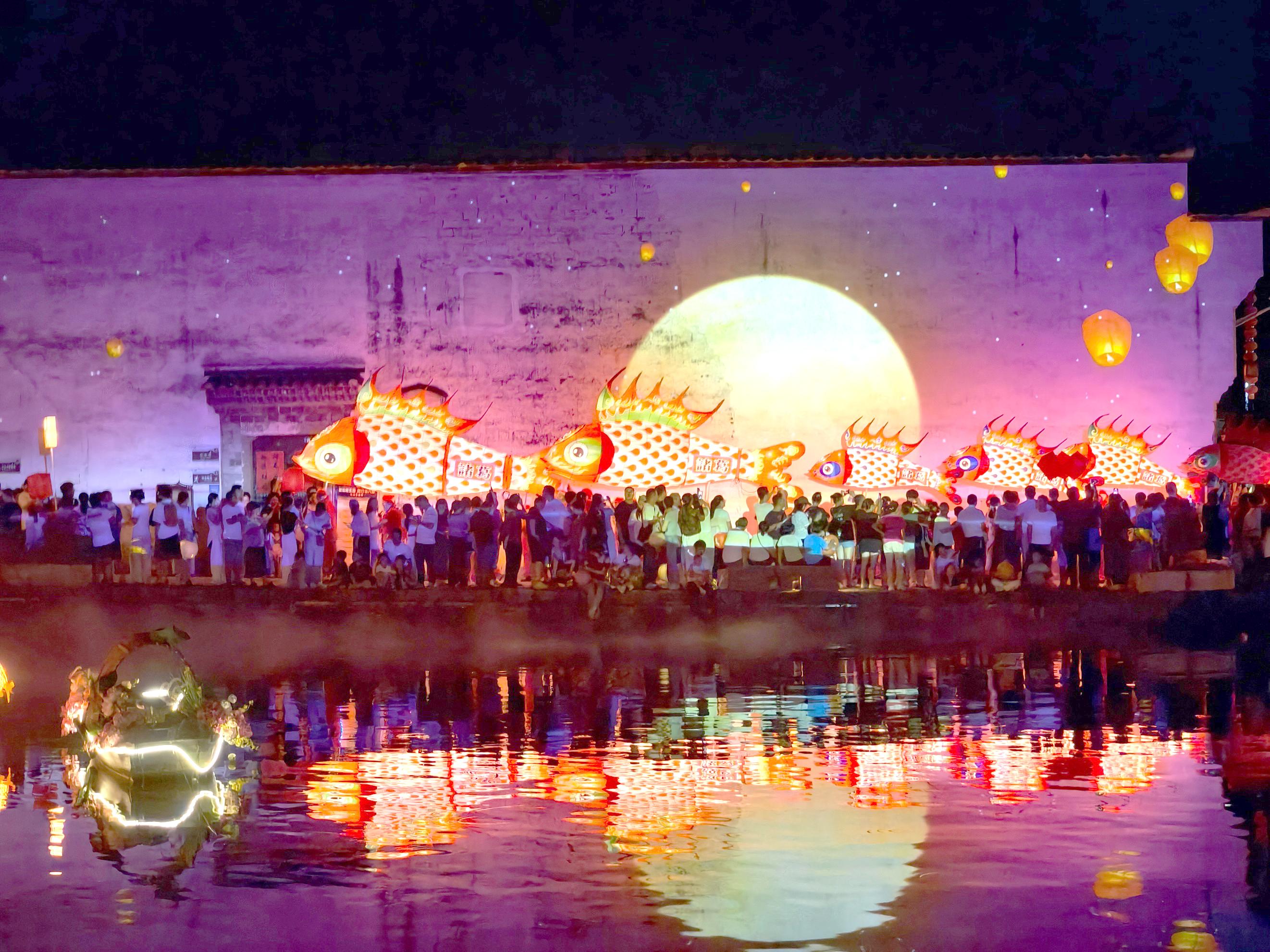 10月2日晚6时许,兰溪诸葛八卦村的青石板路渐次热闹开来,非遗鱼灯巡游正式启幕。手持鱼灯的巡游者身着传统服饰,步伐随鼓点起伏,鱼灯时而“摆尾”时而“跃水”,游客纷纷举手机追拍,小朋友追着队伍跑,伸手轻触灯身,笑声洒满古巷。当鱼灯巡游至村中心上塘古水道,水面上的花船早已备好“月夜盛宴”。船上悬挂以圆月造型灯,舞者化身“嫦娥”,随悠扬民乐翩跹起舞,水袖翻飞间,倒影在明净水面摇曳生姿。随后,花船上,古典舞与民乐合奏轮番衔接,琵琶、古筝的旋律伴着舞姿流淌。