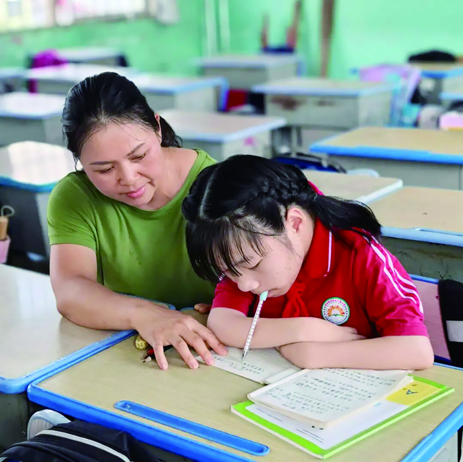教室里,张纪连轻手轻脚地将女儿安置在座位上,仔细摆好书本和文具。因先天性四肢畸形,谢薇娜失去了用手写字的能力,但她用嘴衔笔写出的字迹工整清秀,学习成绩在班级稳居前三。