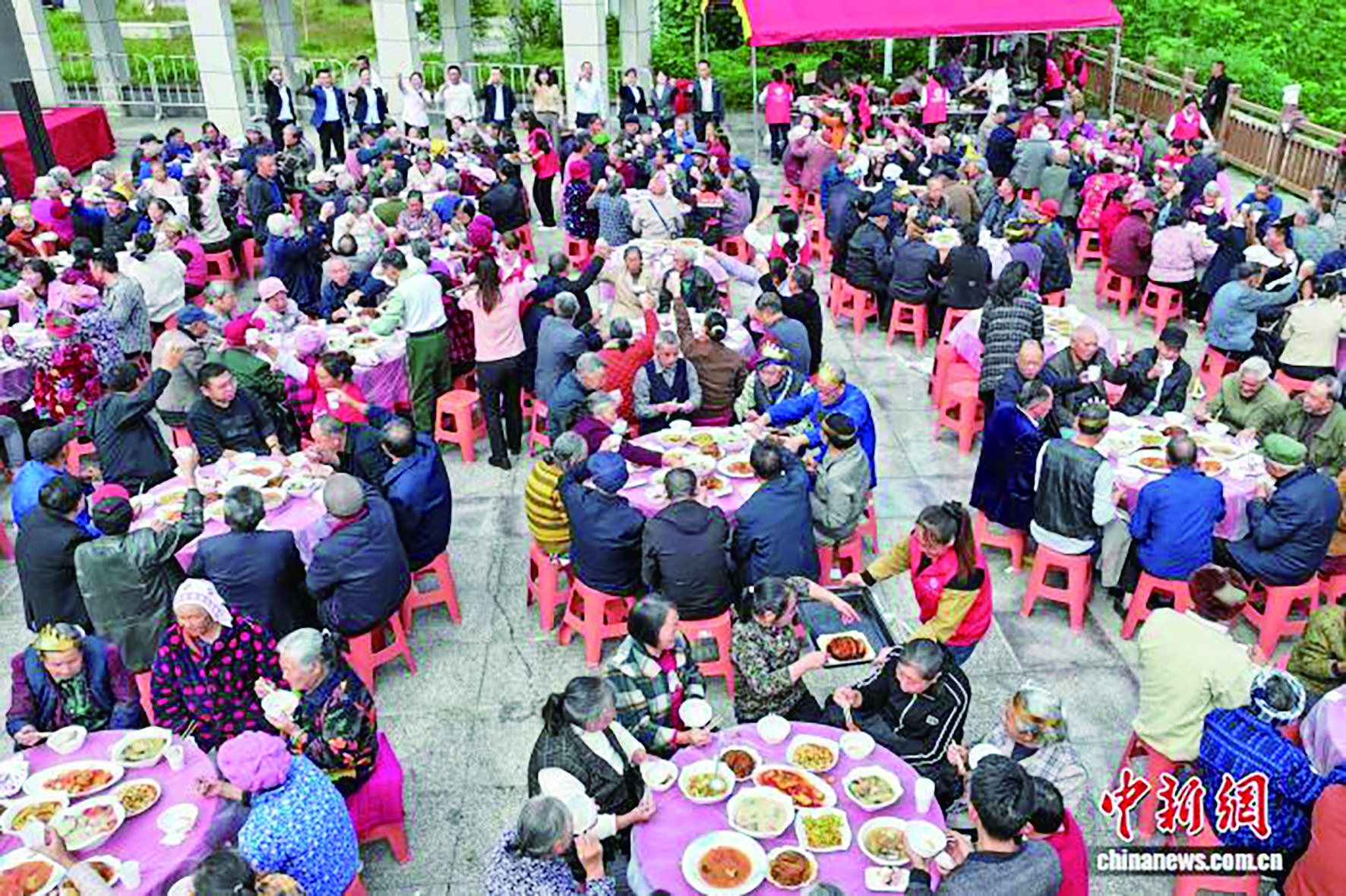10月27日,重庆忠县白石镇长寿河社区300余名老人欢聚一堂吃“坝坝宴”,喜迎重阳佳节。梅菜扣肉、粉蒸肉……一道道美食端上桌子,老人们一边品尝美食,一边聊家常。社区还精心准备了生日蛋糕,为8位老人集体过生日。