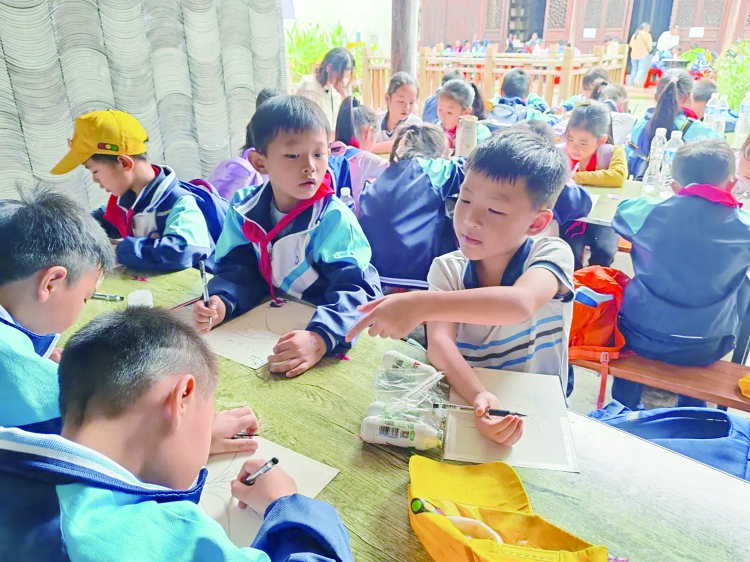 低段学生在天下江南景区跟随讲解员探寻历史典故,通过书写家书、乘游船等活动,体会“山、岛、城、江”交融的诗画意境与文化传承。高段学生走进长乐古村,参与非遗漆扇制作,感受飘漆技艺的千年底蕴;乘坐小火车饱览古村风光,观赏四川变脸、狮子表演等非遗节目,还参观了古灯馆、金大宗祠等场馆,领略民俗文化与历史积淀。